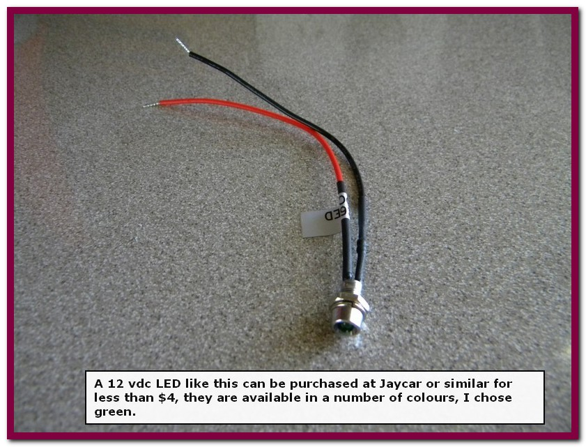 Firstly, I popped into Jaycar and brought a small LED indicator. It cost all of $3.45!! I used green but they are available in blue, amber and red.